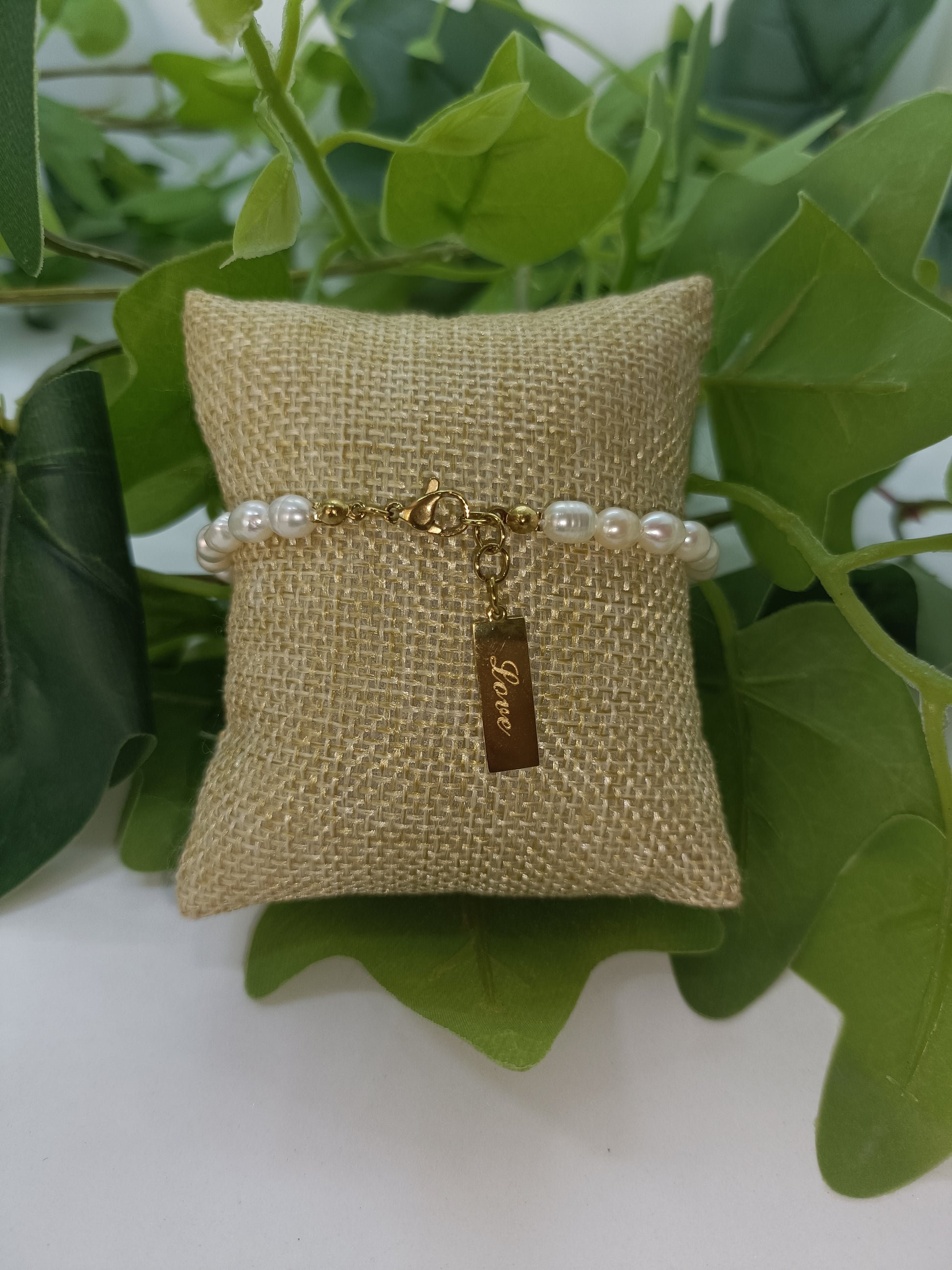 Joli bracelet en véritables perles d'eau douce fini par une breloque gravée "love" et fermoir en acier inoxydable doré.