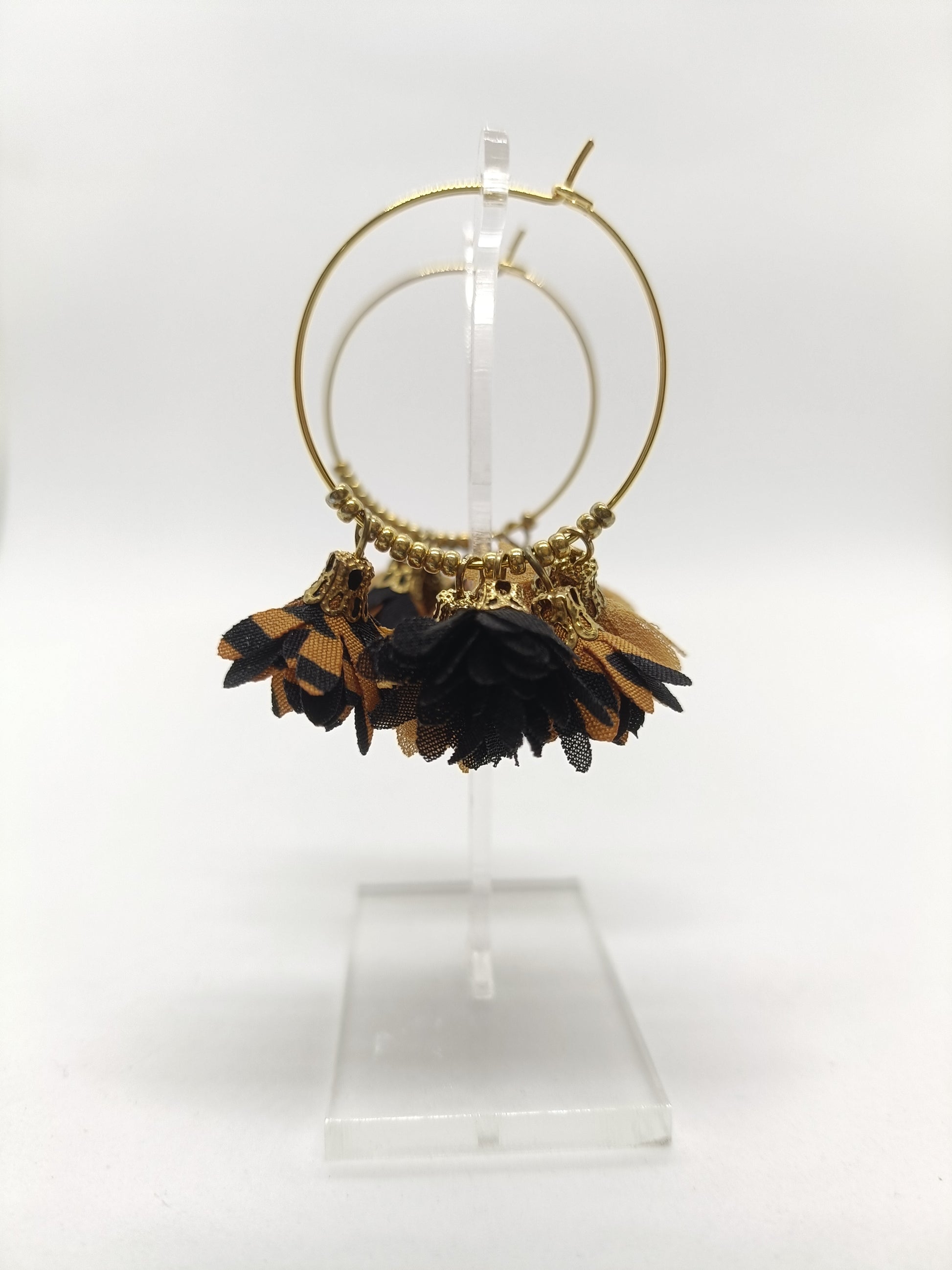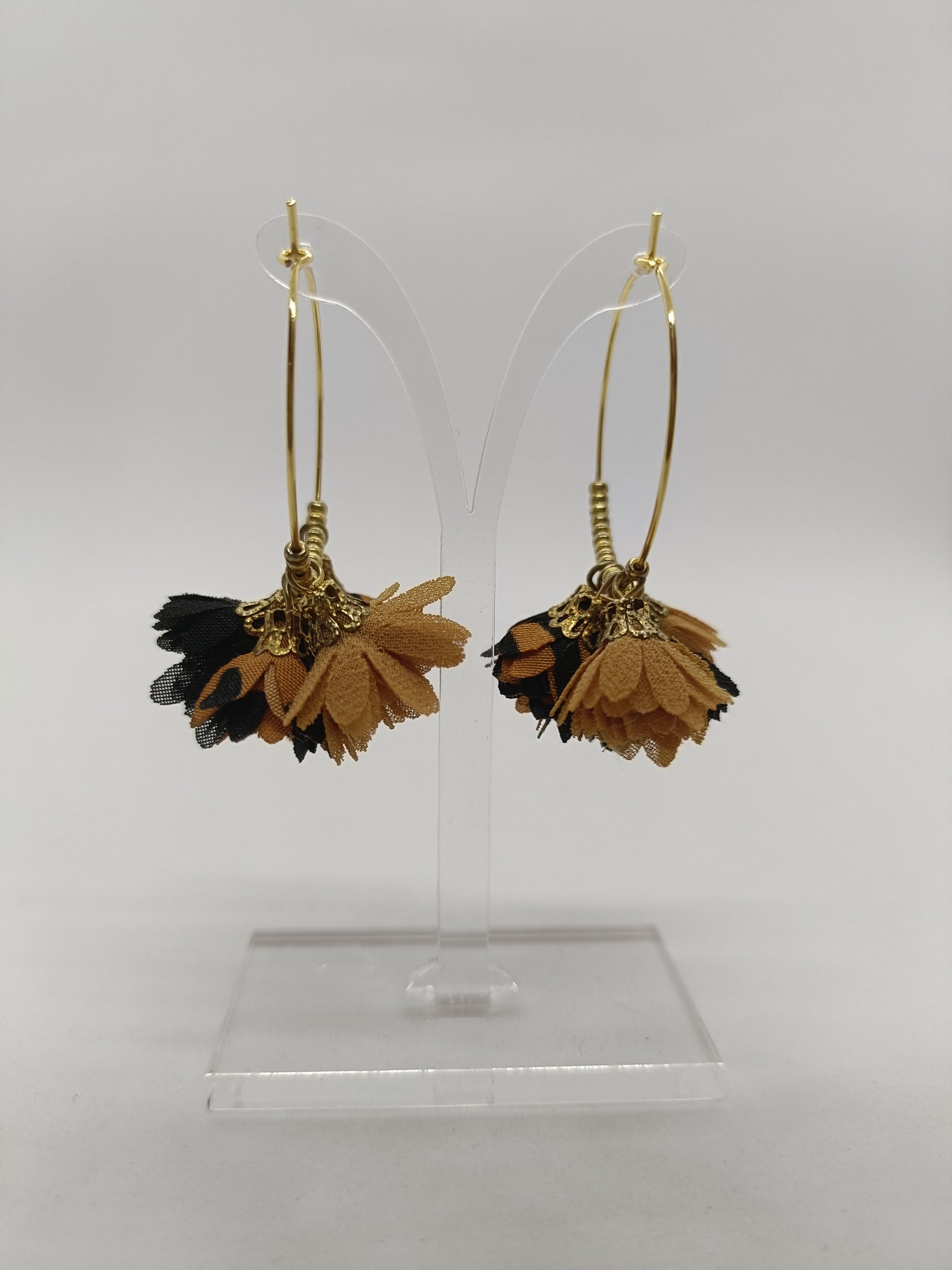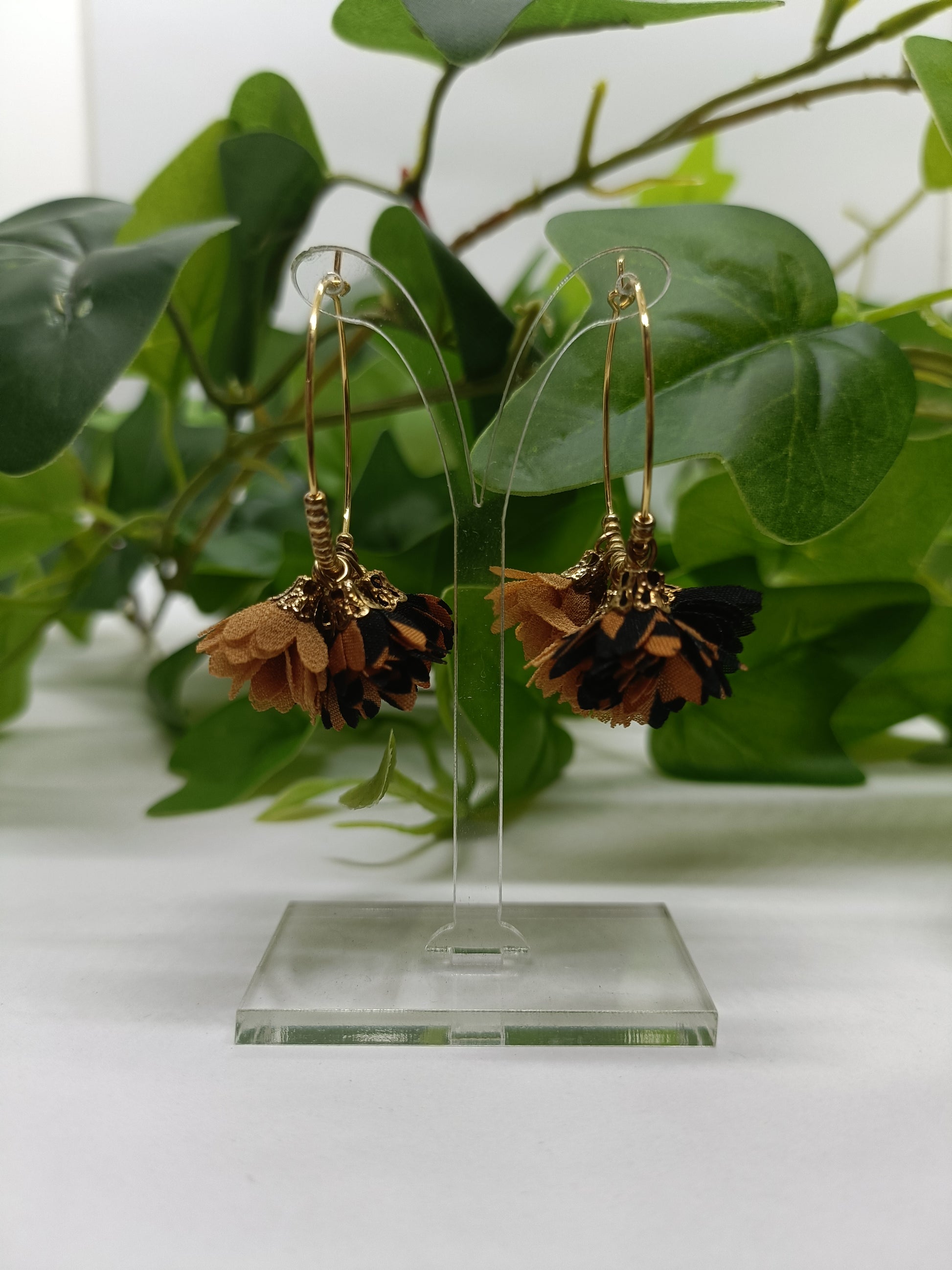 Créoles fines en acier inoxydable doré ornées de pompons en forme de fleur faits avec du tissu a motif léopard.