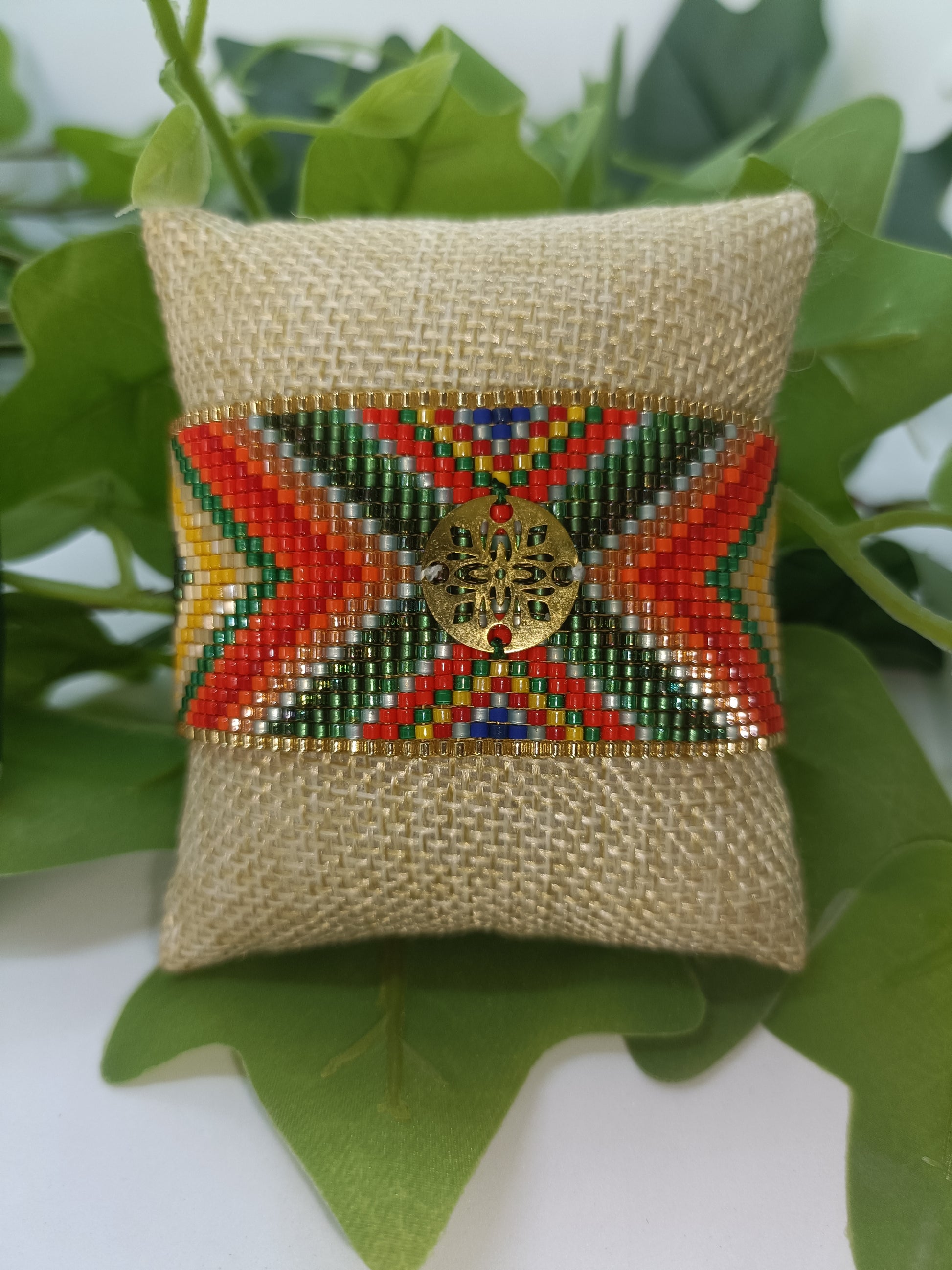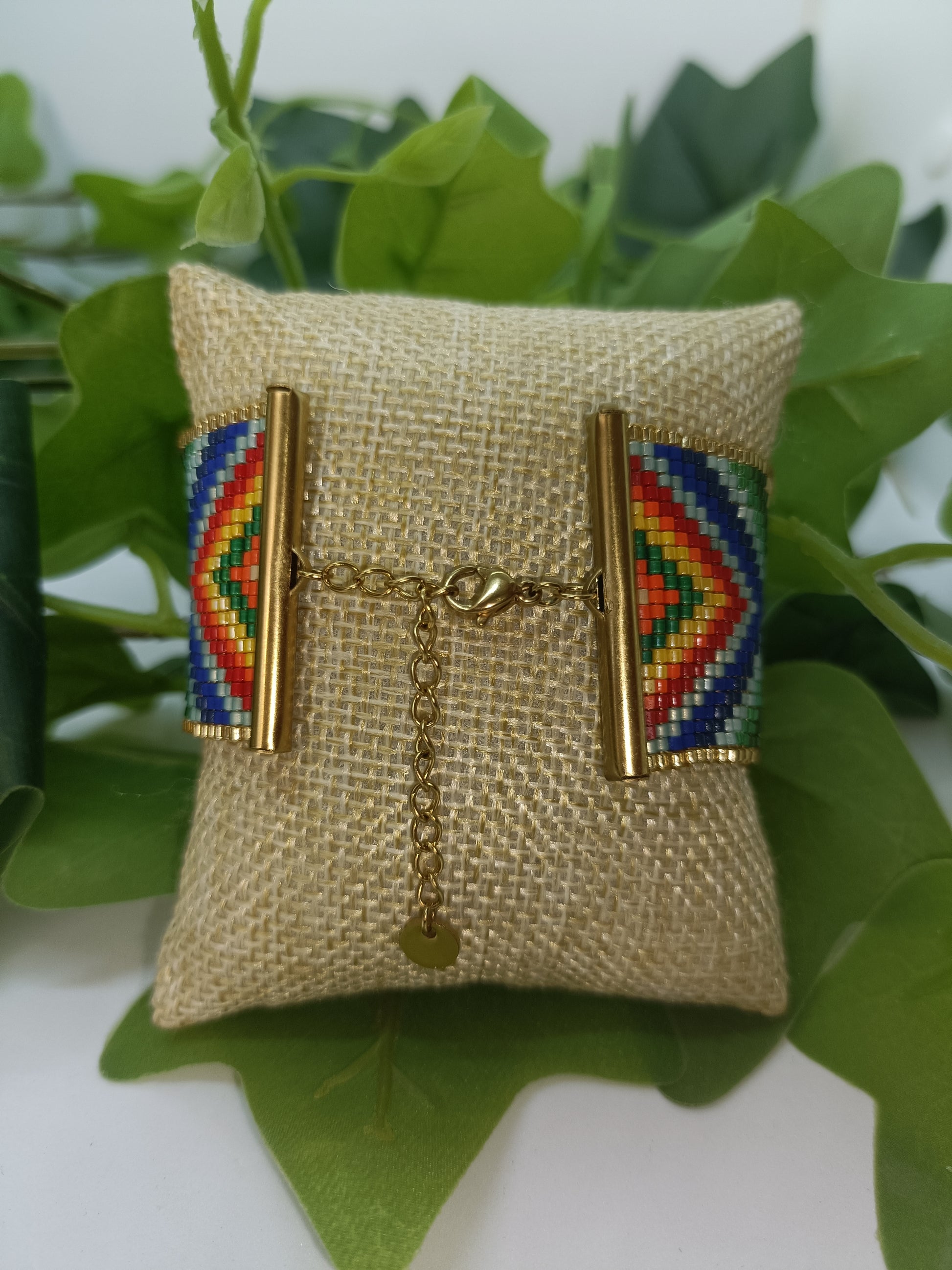 Très belle et large manchette en perles tissées multicolore ornée d'un sequin en acier inoxydable doré. Très léger, il mettra de la gaieté dans vos tenues unies.